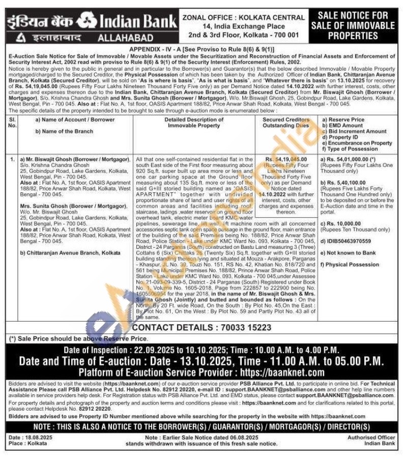 All that one self-contained residential flat in the south East side of the First floor measuring about 920 Sq.ft. super built up area more or less and one car parking space at the Ground floor measuring about 135 Sq.ft. more or less of the said G+III storied building named as "OASIS APARTMENT together with undivided proportionate share of land and user rights of all common areas and facilities including roof, staircase, ladings water reservoir on ground floor overhead tank, electric meter board KMC water pipelines, sewerage line, lift well, lift machine room with all concerned accessories septic tank open space passage in the ground floor, main entrance of the building of the said Premises being No. 188/82, Price Anwar Shah Road, Police Station Lake under KMC Ward No. 093, Kolkata-700 045, District-24 Parganas (South) constructed on Bastu Land measuring 3 (Three) Cottahs 6 (Six) Chittaks 26 (Twenty Six) Sq.ft. together with G+Ill storied building standing thereon lying and situated at Mouza-Arakpore, Parganas Khaspur, JL. No. 39, Touzi No. 151, RS No. 42, Khatian No. 818/720 and 561 being Municipal Premises No. 188/82, Prince Anwar Shah Road, Police Station Lake under KMC Ward No. 093, Kolkata 700 045, under Assessee No. 21-093-09-339-5, District-24 Parganas (South) Registered under Book No. 1. Volume No. 1605-2018, Page from 222857 to 222900 being No. 1605506954 for the year 2018, in the name of Mr. Biswajit Ghosh & Mrs. Sunita Ghosh (Jointly) and butted and bounded as follows: On the North: By 20 Ft. wide Road, On the South By Plot No. 45. On the East: By Plot No. 61, On the West: By Plot No. 59 and Partly Plot No. 43 all of the same.