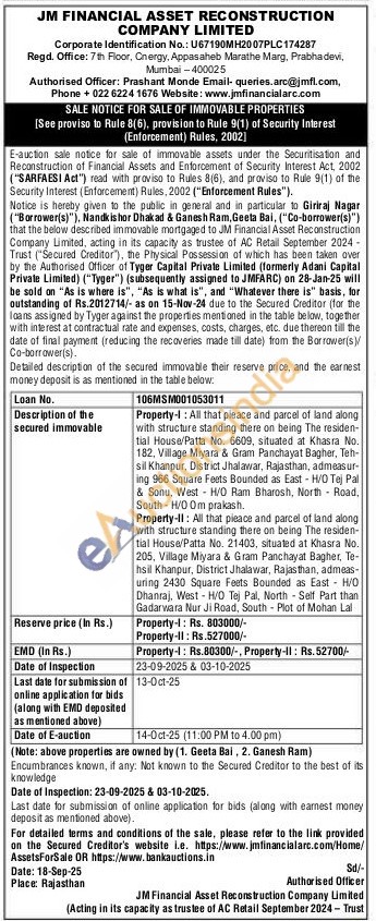 Property-II: All that pieace and parcel of land along with structure standing there on being The residen-tial House/Patta No. 21403, situated at Khasra No. 205, Village Miyara & Gram Panchayat Bagher, Te-hsil Khanpur, District Jhalawar, Rajasthan, admeas-uring 2430 Square Feets Bounded as East H/O Dhanraj, West-H/O Tej Pal, North Self Part than Gadarwara Nur Ji Road, South Plot of Mohan Lal