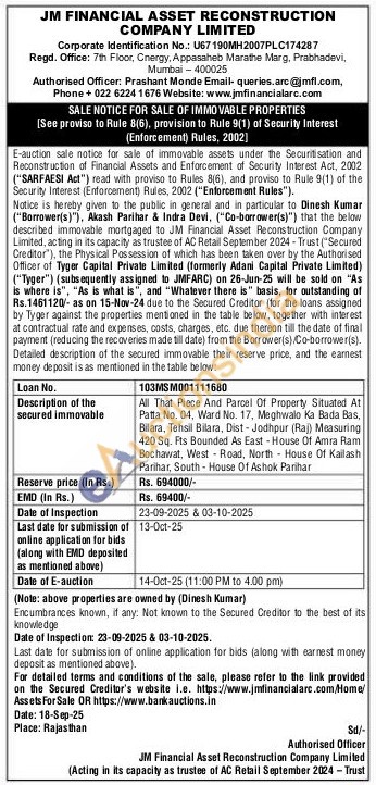 All That Piece And Parcel Of Property Situated At Patta No. 04, Ward No. 17. Meghwalo Ka Bada Bas, Bilara, Tehsil Bilara, Dist-Jodhpur (Raj) Measuring 420 Sq. Fts Bounded As East House Of Amra Ram Bochawat, West Road, North House Of Kailash Parihar, South House Of Ashok Parihar