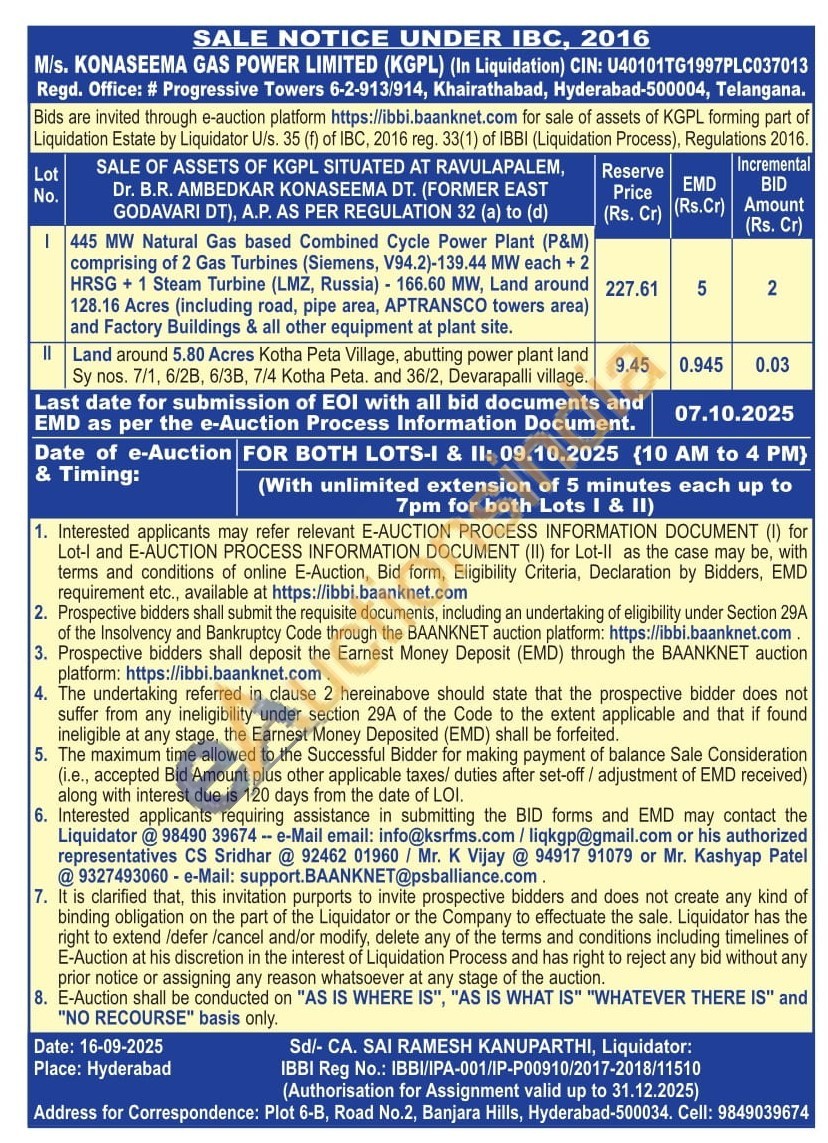 445 MW Natural Gas based Combined Cycle Power Plant (P&M) comprising of 2 Gas Turbines (Siemens, V94.2)-139.44 MW each + 2 HRSG + 1 Steam Turbine (LMZ, Russia) - 166.60 MW, Land around 128.16 Acres (including road, pipe area, APTRANSCO towers area) and Factory Buildings & all other equipment at plant site.