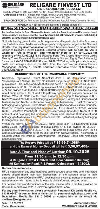 Namakkal Registration District, Namakkal Joint II Sub Registration District, Vasanthapuram Village, Survey No.260/3C punja acres 3.44, S.F No.260/3E punja acres 3.88, in this and extent of punja acres 1,14, sub divided as 260/3E1 punja acres, 5.02, S.F.No.260/3D punja acres 1.53, S.F No.2608/3A punja acres 4.72 sub divided as 260/3A1, S.F.No.360/3B Punja Acres 2.24, in all admeasuring about punja acres 16.95 of land with pathway rights in this property bounded as follows: West of: North South Road, property belonging to Rangaraju in S.F. No.262/2A and 262/2B, land belonging to Sundarajan, Paulraj and Ganesan and Mallusamy and North-South Fence belonging to Mallusamy. East of: Property belonging to Sengamali, North-South Panchayat Road and Nallusamy Gounder, South of: Property belonging to Rangaraju in S.F No.262/2A & 262/28, Vannan Kuttai, East-West Panchayat Road and Nallur Village boundary. North of 0.50 acres of land belonging to Sundarajan, Paulraj and Ganesan 0.02 acre of land belonging to Mallusamy, East-West fence and 30ft, East-West pathway belonging to Sengamalal and others.