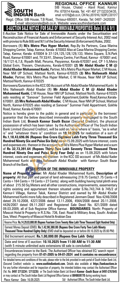 All that part and parcel of land admeasuring 219.75 Cents (1.75 Cents+8 Cents+164 Cents+19 Cents+27 Cents) along with building having total plinth area of about 215.50 Sq.Meters and all other constructions, improvements, easementary rights existing and appurtenant thereon situated under S.No. 743,744 & 745/2 of Kannur-I Village, Kannur Taluk, Kannur District and owned by Mr Abdul Khader Mohammed Kunhi more fully described in Registered Jenmam Deed Nos 4246/2008 dated 29.10.2008, 4227/2006 dated 13.11.2006, 4564/2008 dated 20.11.2008, 4426/2007 dated 09.11.2007 and Registered Sale Deed No. 821/2009 dated 09.03.2009, all of Sub Registrar Office Kannur. BOUNDARIES: North: Property of Mascot Hotel & Property in R.S.No. 736, East: Road & Military Area, South: Arabian Sea, West: Property of Mascot Hotel & Arabian Sea