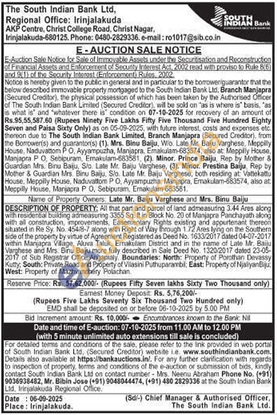 All that part and parcel of land admeasuring 3.44 Ares along with residential building admeasuring 3355 Sq. It in Block No. 20 of Manjapra Panchayath along with all construction, improvements, Easementary Rights existing and appurtenant thereon situated in Re Sy. No. 454/8-7 along with Right of Way Ihrough 1.72 Ares lying on the Southern side of the property by virtue of Agreement Registered as Deed No. 1633/2017 dated 04-07-2017 within Manijapra Village, Aluva Taluk, Emakulam District and in the name of Late Mr. Baiju Varghese and Mrs. Binu Baju more fully described in Sale Deed No. 1320/2017 dated 23-05-2017 of Sub Registrar Office Angamaly. Boundaries: North: Property of Porothan Devassy Kutty, South: Private Road and Property of Vilasini Puthuparambil; East: Property of Njaliyan Biju, West: Property of Mazhvanchery Polachan.
