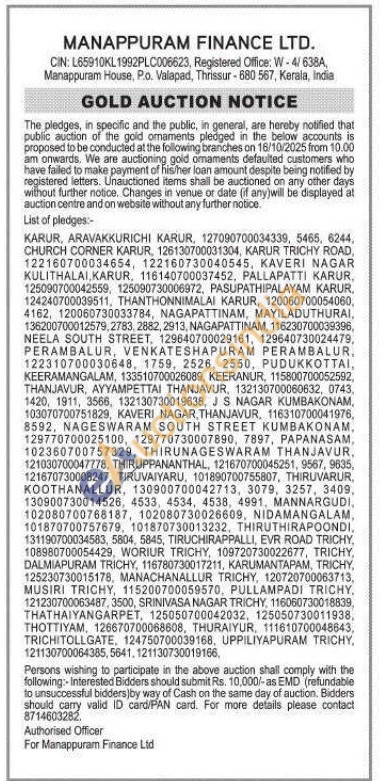 Manappuram Finance Ltd Gold Auctions Auction in Karur