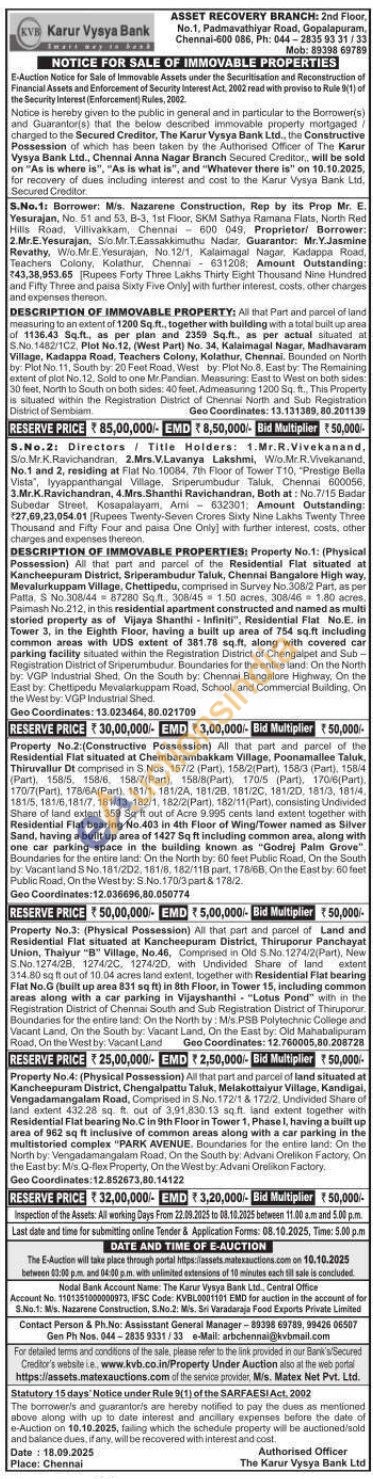 Property No.3: (Physical Possession) All that part and parcel of Land and Residential Flat situated at Kancheepuram District, Thiruporur Panchayat Union, Thaiyur "B" Village, No.46, Comprised in Old S.No. 1274/2(Part), New S.No. 1274/28, 1274/2C, 1274/2D, with Undivided Share of land extent 314.80 sq ft out of 10.04 acres land extent, together with Residential Flat bearing Flat No.G (built up area 831 sq ft) in 8th Floor, in Tower 15, including common areas along with a car parking in Vijayshanthi "Lotus Pond" with in the Registration District of Chennai South and Sub Registration District of Thiruporur. Boundaries for the entire land: On the North by: M/s PSB Polytechnic College and Vacant Land, On the South by: Vacant Land, On the East by: Old Mahabalipuram