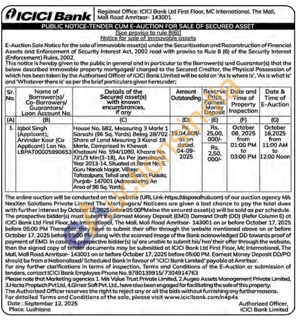 House No. 582, Measuring 3 Marle 1 Sarsahi (96 Sq. Yards) Being 28/702 Share of Land Mesuring 3 Kanal 18 Marle, Comprised In Khewat Khatauni No. 594/1080, Khasra No. 7//1/3 Min (3-18), As Per Jamabandi Year 2013-14, Situated at Street No. 5, Guru Nanak Nagar, Village Tafazolpura, Tehsil and District Patiala, Punjab-147001 (Admeasuring An Area of 96 Sq. Yards