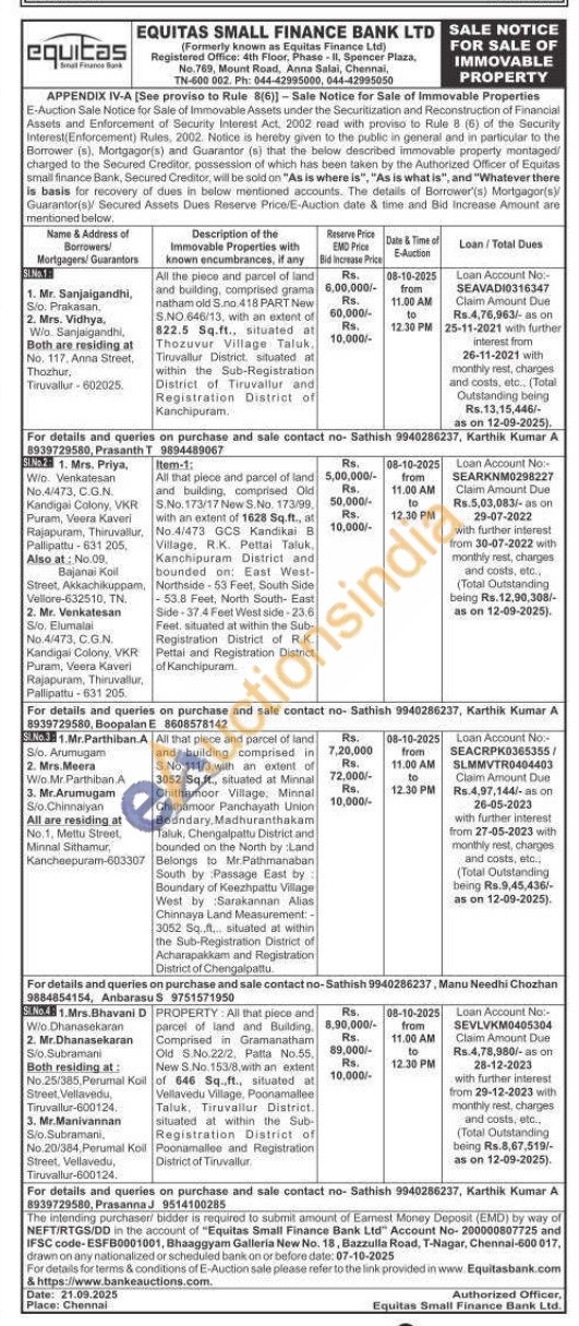 PROPERTY: All that piece and parcel of land and Building. Comprised in Gramanatham Old S.No.22/2, Patta No.55. New S.No. 153/8, with an extent of 646 Sq.ft., situated at Vellavedu Village, Poonamallee Taluk, Tiruvallur District situated at within the Sub Registration District of Poonamallee and Registration District of Tiruvallur.