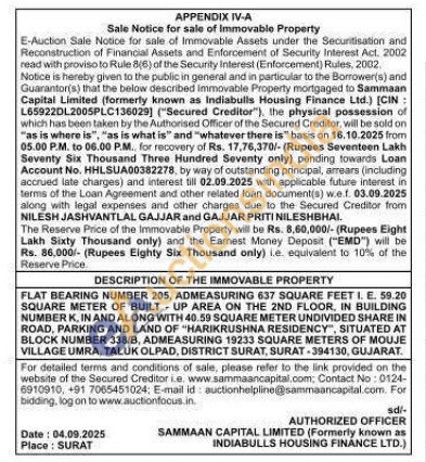 FLAT BEARING NUMBER 205, ADMEASURING 637 SQUARE FEET 1. E. 59.20 SQUARE METER OF BUILT-UP AREA ON THE 2ND FLOOR, IN BUILDING NUMBER K, IN AND ALONG WITH 40.59 SQUARE METER UNDIVIDED SHARE IN ROAD, PARKING AND LAND OF "HARIKRUSHNA RESIDENCY, SITUATED AT BLOCK NUMBER 338/B, ADMEASURING 19233 SQUARE METERS OF MOUJE VILLAGE UMRA, TALUK OLPAD, DISTRICT SURAT, SURAT-394130, GUJARAT