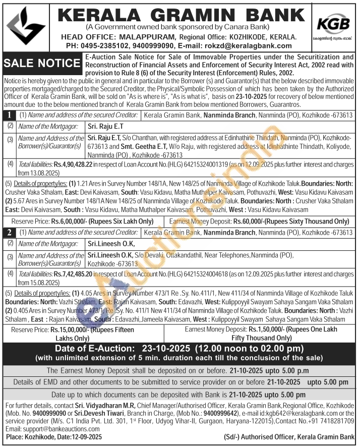 (5) Details of property/ies: (1) 1.21 Ares in Survey Number 148/1A, New 148/25 of Nanminda Village of Kozhikode Taluk. Boundaries: North: Crusher Vaka Sthalam, East: Devi Kaivasam, South: Vasu Kidavu, Matha Muthalper Kaivasam, Pothuvazhi, West: Vasu Kidavu Kaivasam (2) 5.67 Ares in Survey Number 148/1A New 148/25 of Nanminda Village of Kozhikode Taluk. Boundaries: North: Crusher Vaka Sthalam East: Devi Kaivasam, South: Vasu Kidavu, Matha Muthalper Kaivasam, Pothuvazhi, West: Vasu Kidavu Kaivasam
