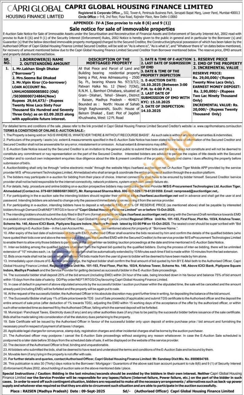 All that Piece and Parcel of Land and Building bearing residential property being a Plot, Area Admeasuring 2500 Sq. Ft, bearing Khasra No. 97/3/7/2, Patwari Halka No. 12 (New) 7(Old), R.N.M. 1, Bamhori Chhabara, situated at Gram-Dilahari, Tehsil Silwani, District Raisen, Madhya Pradesh 464671 Bounded as: North: House of Sahab Singh Raghuwanshi, South: House of Balram Dhakad, East: Plot of Jagdish Khushwaha, West: 12 Ft. Road