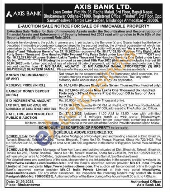 SCHEDULE-A: Collateral Security, Equitable Mortgage of Non-Agri Land and building situated at Dist: Bhadrak, Tahasil: Bhadrak, Tahasil No.250, Thana: Bhadrak, Thana No. 110, Mouza: Kuansa, Khata No.723/3428, Plot No. 195/2242/3162, admeasuring an area Ac 0.040 dec, registered in the name of Bijayeeni Samal, W/o-Akshaya Samal SCHEDULE-B: Equitable Mortgage of Non-Agri Land and building situated at Dist: Bhadrak, Tahasil Bhadrak, Tahasil No.250, Thana: Bhadrak, Thana No. 110, Mouza: Kuansa, Khata No. 723/3429, Plot No. 195/2242/3157, admeasuring an area Ac 0.040 dec, registered in the name of Akshaya Samal, Sio-Sanatan Samal