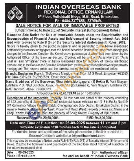 All that part and parcel of the property consisting of 1.92 ares of land along with 1097 sqft residential house with door no: 1/413 in Re. Sy No:419/3/7 Karimalloor Village Paravoor Taluk, Chengamanadu Sub-District, Emakulam District, in the name of Rekha R. Boundaries: East: Property of Majid; West: Property of Arifa and Sharnu and Shaji; North: Panchayath road and property of Shaji, South: Property of Vijil Kumar