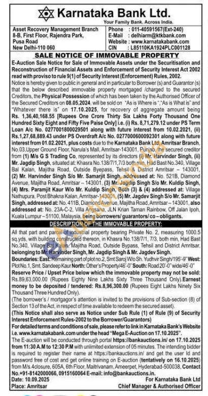 All that part and parcel of industrial property bearing Private No. 2, measuring 1000.5 sq.yds, with building constructed thereon, in Khasra No. 138/7/1, 7/3, both min, Had Bast No.340, Village Bal Kalan, Majitha Road, Outside Bypass, Tehsil and District Amnitsar belonging to Mr. Harvinder Singh, Mr. Jagdip Singh & Mr. Jagdev Singh. Boundaries: East: Remaining part of plot no.2, Smt Saroj Wio Sh. Yudhvir Singh/195-9" West: Plot No. 1, Smt. Sandeep Kaur North: Other's Property/46-0" South: Road 20-0" wide/46-0