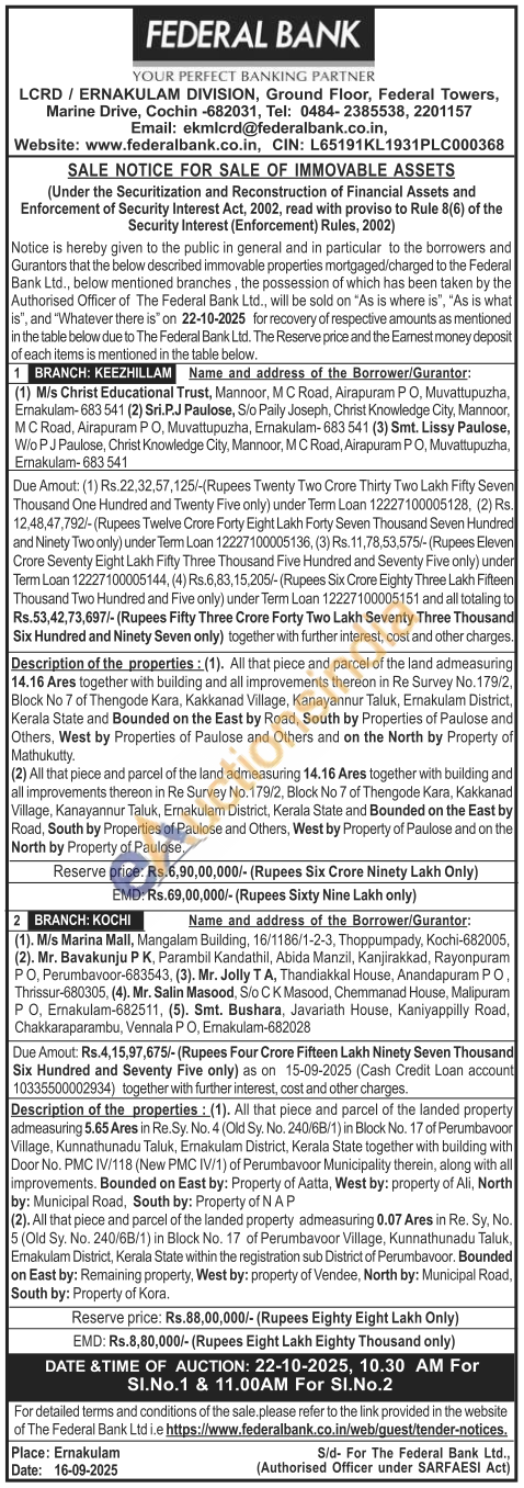 . Description admeasuring 5.65 Ares in Re.Sy. No. 4 (Old Sy. No. 240/68/1) in Block No. 17 of Perumbavoor Village, Kunnathunadu Taluk, Emakulam District, Kerala State together with building with Door No. PMC IV/118 (New PMC IV/1) of Perumbavoor Municipality therein, along with all improvements. Bounded on East by: Property of Aatta, West by: property of Ali. North by: Municipal Road, South by: Property of NAP (2). All that piece and parcel of the landed property admeasuring 0.07 Ares in Re. Sy, No. 5 (Old Sy. No. 240/6B/1) in Block No. 17 of Perumbavoor Village, Kunnathunadu Taluk, Emakulam District, Kerala State within the registration sub District of Perumbavoor. Bounded on East by: Remaining property, West by: property of Vendee, North by: Municipal Road, South by: Property of Kora.(2) All that piece and parcel of the land admeasuring 14.16 Ares together with building and all improvements thereon in Re Survey No. 179/2, Block No 7 of Thengode Kara, Kakkanad Village, Kanayannur Taluk, Ernakulam District, Kerala State and Bounded on the East by Road, South by Properties of Paulose and Others, West by Property of Paulose and on the North by Property of Paulose.