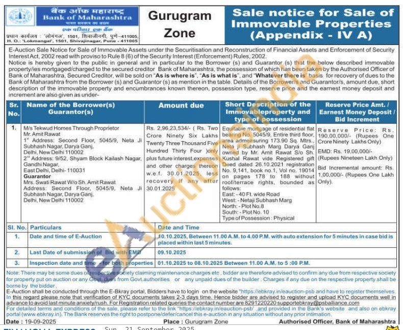 Equitable mortgage of residential flat bearing No. 5045/9, Entire third floor, area admeasuring 173.90 Sq. Mtrs., Netaji Subhash Marg Darya Ganj owned by Mr. Amit Rawat S/o Sh. Kushal Rawat vide Registered gift Deed dated 26.10.2021 registration No. 9,141, book no.1, Vol no. 19014 on pages 178 to 188 without roof/terrace rights, bounded as follows: East:-40 FL wide Road West:-Netaji Subhash Marg North:-Plot No.8 South: Plot No. 10 Type of Possession: Physical