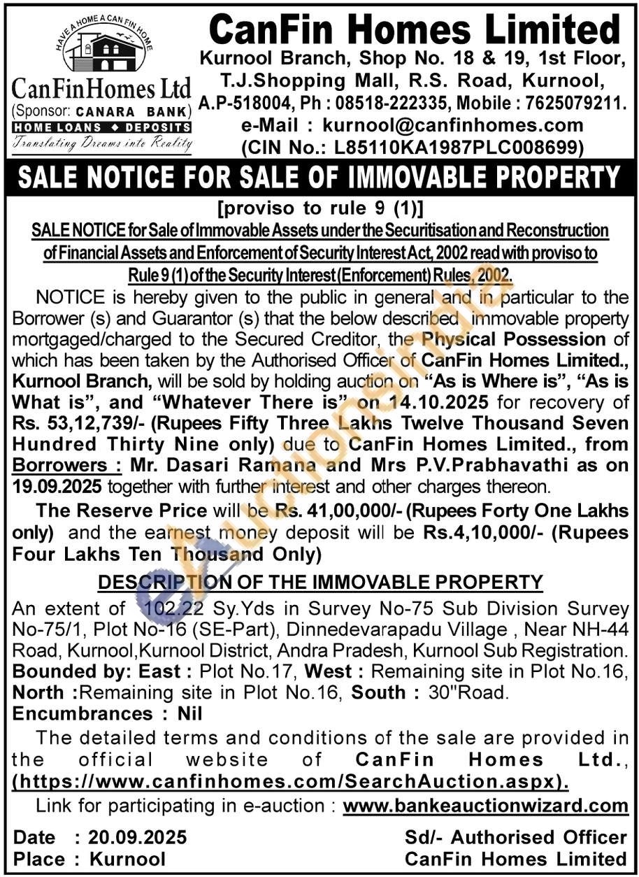 An extent of 102.22 Sy. Yds in Survey No-75 Sub Division Survey No-75/1, Plot No-16 (SE-Part), Dinnedevarapadu Village, Near NH-44 Road, Kurnool, Kurnool District, Andra Pradesh, Kurnool Sub Registration. Bounded by: East: Plot No. 17, West: Remaining site in Plot No. 16, North: Remaining site in Plot No. 16, South: 30"Road