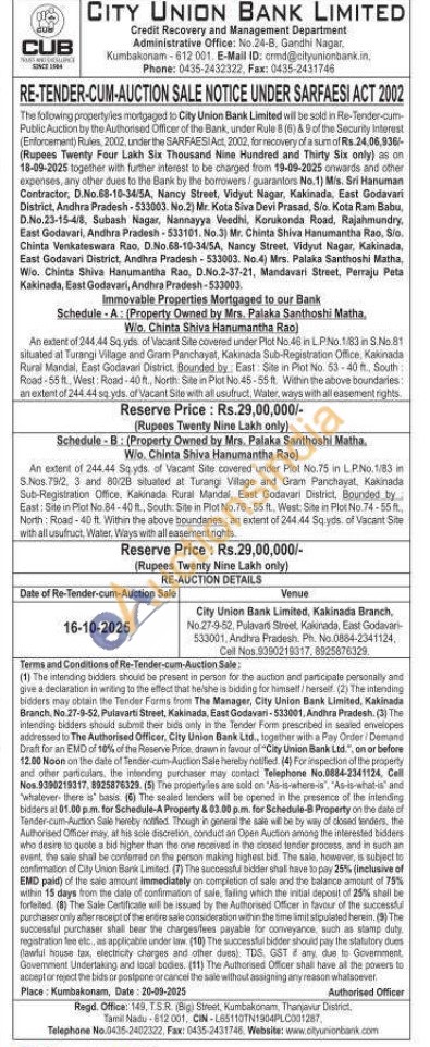 2) An extent of 244.44 Sq yds of Vacant Site covered under Plot No.75 in L.P.No.1/83 in 5. Nos. 79/2, 3 and 80/28 situated at Turang Village and Gram Panchayat, Kakinada Sub-Registration Office, Kakinada Rural Mandal East Godavari District, Bounded try East: Site in Plot No 84-40ft, South Side in Plot No.76-55 West Site Plot No. 74-55ft North: Road-40 ft. Within the above boundaries, an extent of 244.44 50 yds. of Vacant Site with all usufruct, Water Ways with all easement rights