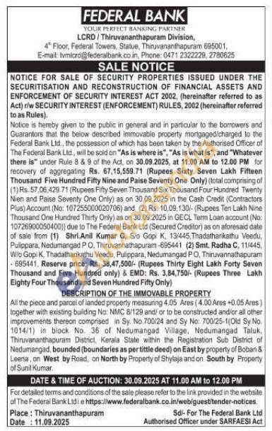All the piece and parcel of landed properly measunng 4.05 Ares (4.00 Ares +0.05 Ares) together with existing building No: NMC 8/129 and/or to be constructed andior all other improvements thereon comprised in Sy. No.700/24 and Sy No: 700/25-1(Old Sy No. 1014/1) in block No. 36 of Nedumangad Village, Nedumangad Taluk, Thiruvananthapuram District, Kerala State within the Registration Sub District of Nedumangad, bounded (boundaries as per tittle deed) on East by property of Boban & Leena, on West by Road, on North by Property of Shylaja and on South by Property of Sunil Kumar.