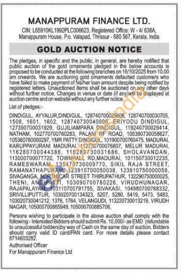 Manappuram Finance Ltd Gold Auctions Auction in Dindigul