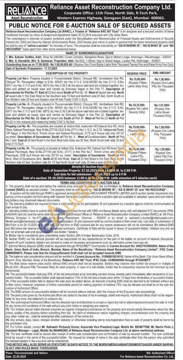 Contact Mr. Satheesh Pichandy Kumar, Associate Vice President-Legal, Mobile No. 8939677550, Mr. Nevlin Pinto J, Assistant Manager-Legal, Mobile No.9004962963