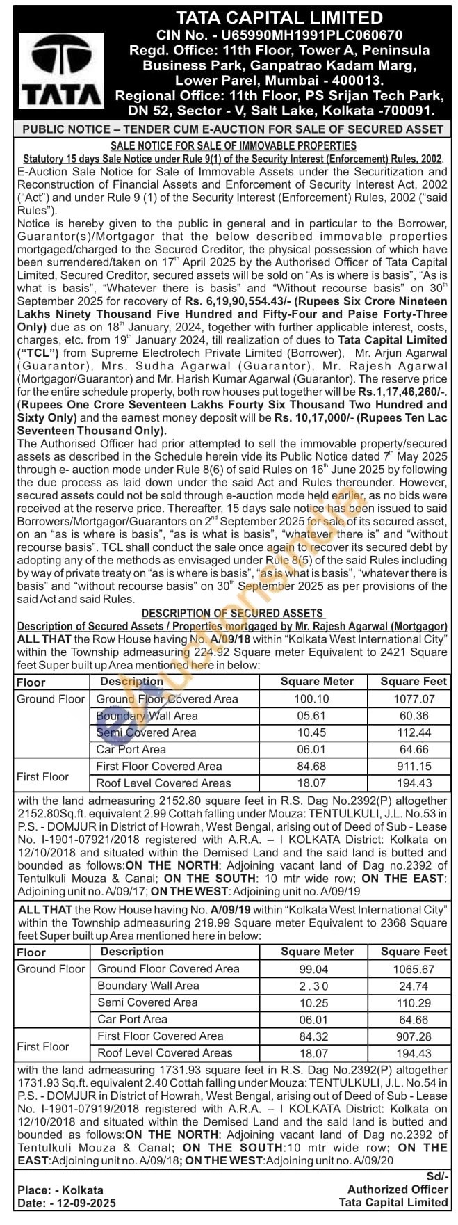 Description of Secured Assets/Properties mortgaged by Mr. Rajesh Agarwal (Mortgagor) ALL THAT the Row House having No. A/09/18 within "Kolkata West International City" within the Township admeasuring 224.92 Square meter Equivalent to 2421 Square feet Super built up Area mentioned here in below: with the land admeasuring 2152.80 square feet in R.S. Dag No.2392(P) altogether 2152.80Sq.ft. equivalent 2.99 Cottah falling under Mouza: TENTULKULI, J.L. No.53 in P.S.-DOMJUR in District of Howrah, West Bengal, arising out of Deed of Sub-Lease No. 1-1901-07921/2018 registered with A.R.A. KOLKATA District: Kolkata on 12/10/2018 and situated within the Demised Land and the said land is butted and bounded as follows:ON THE NORTH: Adjoining vacant land of Dag no.2392 of Tentulkuli Mouza & Canal, ON THE SOUTH: 10 mir wide row; ON THE EAST Adjoining unit no. A/09/17; ON THE WEST: Adjoining unit no. A/09/19