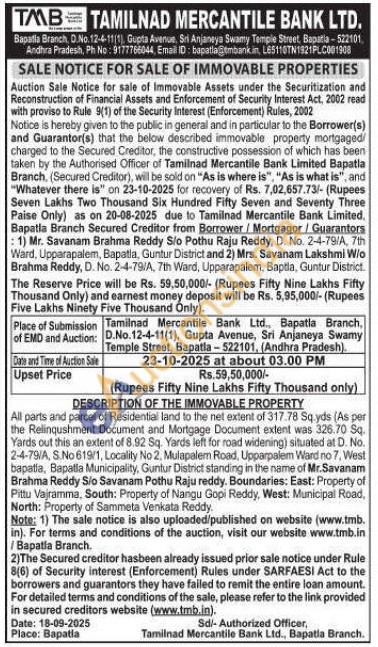 All parts and parcel of Residential land to the net extent of 317.78 Sq.yds (As per the Relinqushment Document and Mortgage Document extent was 326.70 Sq. Yards out this an extent of 8.92 Sq. Yards left for road widening) situated at D. No. 2-4-79/A, S.No 619/1, Locality No 2, Mulapalen Road, Upparpalem Ward no 7, West bapatia, Bapatla Municipality, Guntur District standing in the name of Mr.Savanam Brahma Reddy Sio Savanam Pothu Raju reddy. Boundaries: East: Property of Pittu Vajramma, South: Property of Nangu Gopi Reddy, West: Municipal Road, North: Property of Sammeta Venkata Reddy.