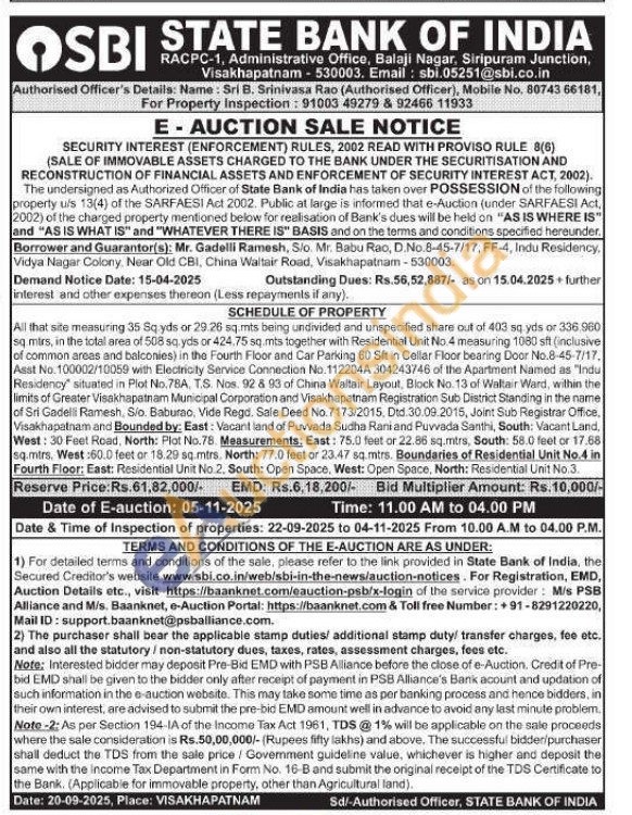 All that site measuring 35 Sq yds or 29.26 sq.mts being undivided and unspecified share out of 403 sq yds or 336 960 sq mirs, in the total area of 508 sq yds or 424,75 sq.mts together with Residential Unit No. 4 measuring 1080 sff (inclusive of common areas and balconies) in the Fourth Floor and Car Parking 60 Sit in Cellar Floor bearing Door No.8-45-7/17, Asst No. 100002/10059 with Electricity Service Connection No.112204A 304243746 of the Apartment Named as "Indu Residency situated in Plot No.78A, T.S. Nos. 92 & 93 of China Waltair Layout, Block No. 13 of Waltair Ward, within the limits of Greater Visakhapatnam Municipal Corporation and Visakhapatnam Registration Sub District Standing in the name of Sri Gadelli Ramesh, Sio. Baburao, Vide Regd. Sale Deed No. 7173/2015, Dtd. 30.09.2015, Joint Sub Registrar Office, Visakhapatnam and Bounded by: East: Vacant land of Puvvada Sudha Rani and Puvvada Santhi, South: Vacant Land, West: 30 Feet Road, North: Plot No.78. Measurements: East: 75.0 feet or 22.86 sq.mtrs, South: 58.0 feet or 17.68 sq.mirs. West:60.0 feet or 18.29 sq.mtrs. North: 77.0 feet or 23.47 sq.mtrs. Boundaries of Residential Unit No.4 in Fourth Floor: East: Residential Unit No.2. South: Open Space, West: Open Space, North: Residential Unit No.3