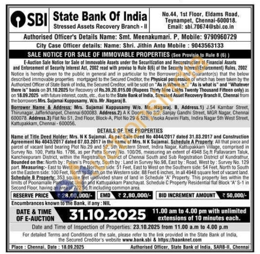 All that piece and parcel of vacant land bearing Plot No.29 and 52, 5th Western Street, Indira Nagar, Kattupakkam Village, comprised in Survey No. 100, Patta No. 1786, as per Patta Survey No. 100/26, measuring an extent of 4948 Sq.ft. Pallavaram Taluk, Kancheepuram District, within the Registration District of Chennai South and Sub Registration District of Kundrathur, Bounded on the: North by: Palani's Property, South by: Land in Survey No.98, East by Road, West by: Survey No. 129 part. Measuring:- East to West on the Northern side: 51 Feet, East to West on the Southern side: 54 Feet, North to South on the Eastern side: 100 Feet, North to South on the Western side: 88 Feet 6 inches, In all 4948 square feet of vacant land. Schedule B Property: 353 square feet undivided share of land in Schedule 'A' Property. This property lies within the limits of Poonamalle Panchayat Union and Kattupakkam Panchayat. Schedule C Property Residential flat Block "A"S-1 in Second Floor, having an area of 722 Sq.ft including common area