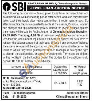 State Bank of India Gold Auctions Auction in Karur