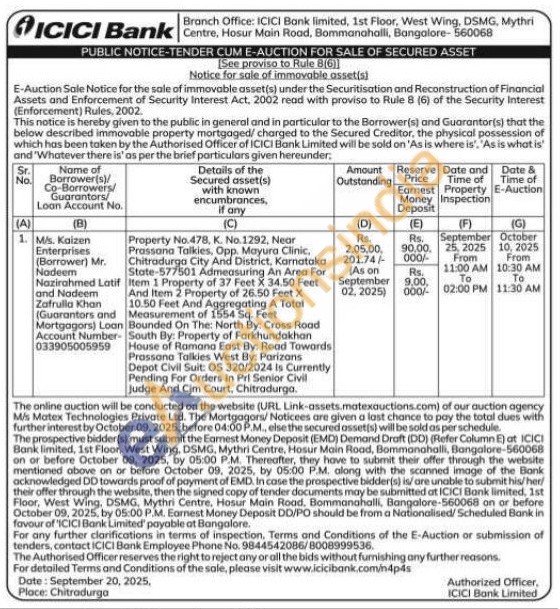 Property No.478, K. No.1292, Near Prassana Talkies, Opp. Mayura Clinic, Chitradurga City And District, Karnataka State-577501 Admeasuring An Area For Item 1 Property of 37 Feet X 34.50 Feet And Item 2. Property of 26.50 Feet X 10.50 Feet And Aggregating A Total Measurement of 1554 Sq. Feet Bounded On The: North By: Cross Road South By: Property of Farkhundakhan House of Ramana East By: Road Towards Prassana Talkies West By: Parizons Depot Civil Suit: OS 320/2024 Is Currently Pending For Orders In Pri Senior Civil Judge And Cim Court, Chitradurga.