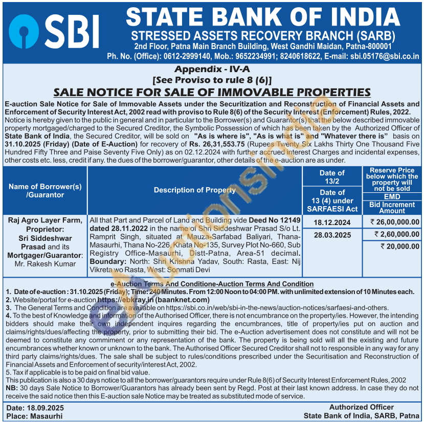 All that Part and Parcel of Land and Building vide Deed No 12149 dated 28.11.2022 in the name of Shri Siddeshwar Prasad S/o Lt. Ramprit Singh, situated at Mauza-Sarfabad Baliyari, Thana-Masaurhi, Thana No-226, Khata No-135, Survey Plot No-660, Sub Registry Office-Masaurhi, Distt-Patna, Area-51 decimal. Boundary: North: Shri Krishna Yadav, South: Rasta, East: Nij Vikreta wo Rasta, West: Sonmati Devi
