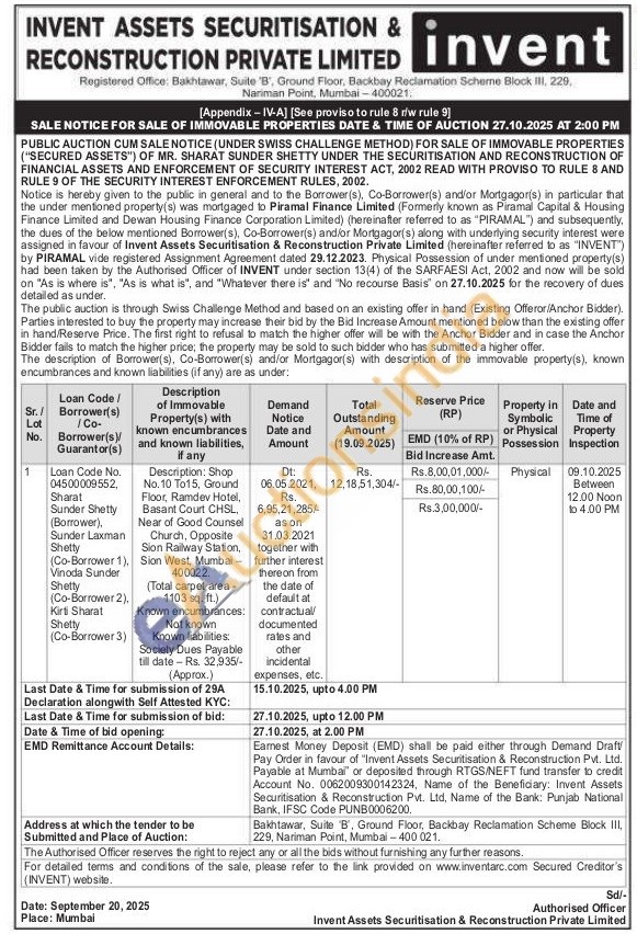 Description: Shop No.10 To15, Ground Floor, Ramdev Hotel, Basant Court CHSL, Near of Good Counsel Church, Opposite Sion Railway Station, Sion West, Mumbai-400022.(Total carpet area -1103 sq. ft.) Known encumbrances, Not known Known liabilities: Society Dues Payable till date-Rs. 32,935/-(Approx.)