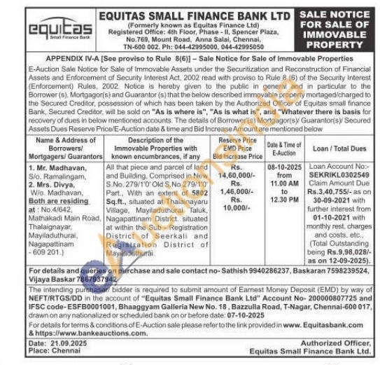 All that piece and parcel of land and Building, Comprised in New S.No. 279/10 Old S.No.279/1'0 Part, With an extent of 5802 Sq.ft., situated at Thalainayaru Village, Mayiladuthurai Taluk, Nagapattinam District situated at within the Sub-Registration District of Seerkali and Registration District of Mayiladuthurai