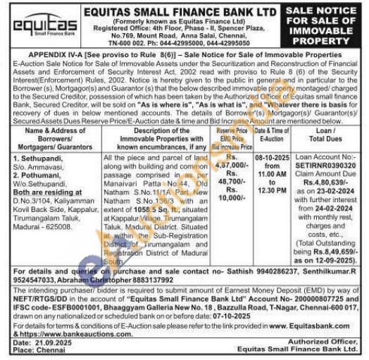 All the piece and parcel of land along with building and common passage comprised in as per Manaivari Patta No.44, Old Natham S.No. 11/1A Part New Natham S.No.136/3 with an extent of 1058.5 Sq. ft., situated at Kappalur Village, Tirumangalam Taluk, Madurai District. Situated at within the Sub-Registration District of Tirumangalam and Registration District of Madurai South