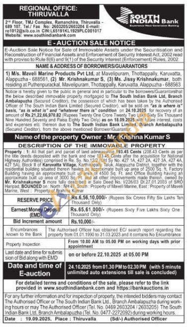 Property 1: All that part and parcel of land admeasuring 193.45 Cents 1208 43 Cents as per the little deeds deposited with the bank and now 193.45 Cents after the acquisition for National Highway Authorities comprised in Re. Sy No 12/2 (Old Sy No 427 1A, 427 24, 427 3A, 427 4A 427 54 Block I of Karuvatta Village, Karthikapally Tajuk Alappuzha Distinct, together with the residential building situated therein having an approximate built up area of 2500 Sqft, Factory Building having an approximate built up area of 4500 Sq. Ft. and Office Building having an approximate buit up area of 3000 Sq. Ft and all other improvements made therein owned by Mr. Krishnakumar $ more fully described in Sale Deed No. 1226/03 Dr.27.01.2003 of SRO Haripad BOUNDED on North NH 47 South Property of Maveli Marine, East Property of Mavell Marine West Property of Brahma Kumar