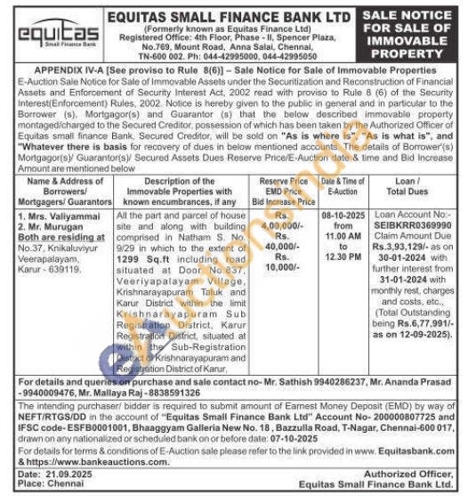 All the part and parcel of house site and along with building comprised in Natham S. No. 9/29 in which to the extent of 1299 Sq.ft including road situated at Door No.837, Veeriyapalayam Village, Krishnarayapuram Taluk and Karur District within the limit Krishnarayapuram Sub Registration District, Karur Registration District, situated at within the Sub-Registration District of Krishnarayapuram and Registration District of Karur