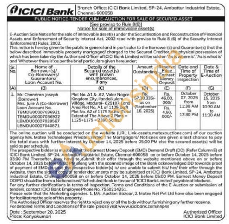 Plot No. A1 & A2, Valar Nagar Kingdom City, Ilandaikulam Village, Madurai-625107 Land Area Plot No. A1 of 1125 Sq.ft Plot No. A2 of 1175 Sq.fts. (Total Extent of The Above 2 Plots = 1125+1175-2300 Sq.fts.)