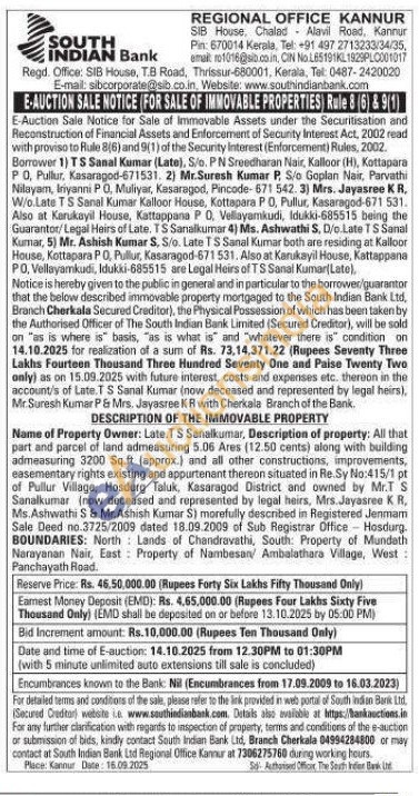 Name of Property Owner: Late.TS Sanalkumar, Description of property: All that part and parcel of land admeasuring 5.06 Ares (12.50 cents) along with building admeasuring 3200 Sq.ft (approx.) and all other constructions, improvements, easementary rights existing and appurtenant thereon situated in Re. Sy No:415/1 pt of Pullur Village, Hosdurg Taluk, Kasaragod District and owned by Mr.T S Sanalkumar (now deceased and represented by legal heirs, Mrs. Jayasree K R, Ms. Ashwathi S & Mr. Ashish Kumar S) morefully described in Registered Jenmam Sale Deed no.3725/2009 dated 18.09.2009 of Sub Registrar Office Hosdurg. BOUNDARIES: North Lands of Chandravathi, South: Property of Mundath Narayanan Nair, East Property of Nambesan Ambalathara Village, West: Panchayath Road.