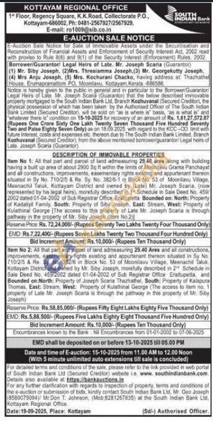 Item No 1: All that part and parser of land admeasuring 29.40 ares along with building having a buit up area of about 2900 5 ft within the limits of Moonlavu Grama Panchayat and all constructions, improvements, easementary rights existing and appurtenant thereon situated in Sy No 710215 & Re. Sy. No. 38216-1 Block No. 53 of Moonilavu Village, Meenachil Taluk, Kottayam District and owned by (Late) Mr. Joseph Scana, (now heins), morefully described in 1 Schedule in Sale Deed No. represented by his legal heins), morefully describe 101-04-2002 of Sub Registrar Office Erattiupetta Bounded on: North: Property 2002 dated 01-04-2002 of Kadaliyil Family, South: Property of Biby Joseph, East: Stream, West: Propedy Kullathinal George [The access to this property of Late Mr. Joseph Scarla is through pathway in the property of Mr. Siby Joseph (tem No.2