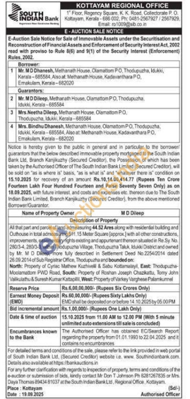 All that part and parcel of land admeasuring 44.52 Ares along with residential building and Outhouse in total admeasuring 511.15 Meter Square [approx.) with all other constructions, improvements, easementary rights existing and appurtenart thereon situated in Re. Sy No. 280/3-4,280-3-3, within Thodupuzha Village, Thodupuzha Taluk, Idukki District and owned by Mr. MD Dileep, more fully described in Settlement Deed No.2254/2014 dated 26.09.2014 of Sub Registrar Office, Thodupuzha and bounded on: