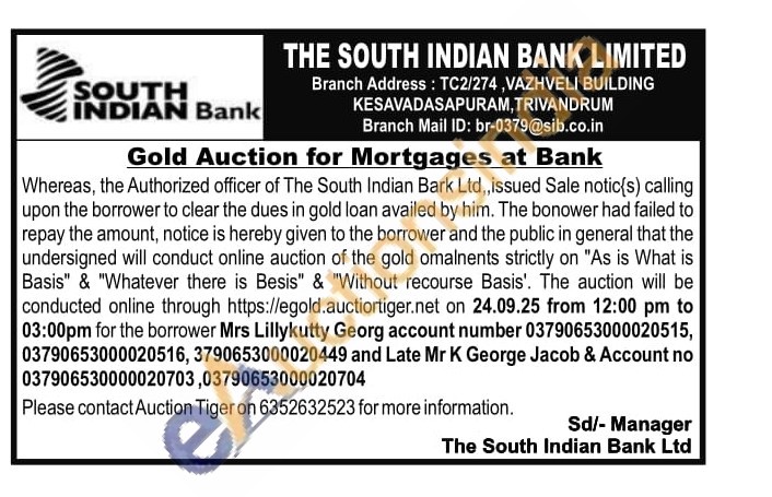 South Indian Bank Gold Auctions Auction in Trivandrum