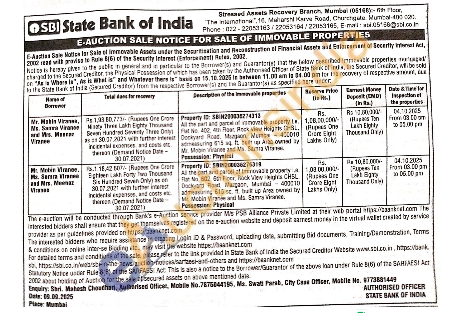 All the part and parcel of immovable property i.e. Flat No. 402, 4th Floor, Rock View Heights CHSL, Dockyard Road, Mazgaon, Mumbai 400010 admeasuring 615 sq. ft. built up Area owned by Mr. Mobin Viranee and Ms. Samra Viranee