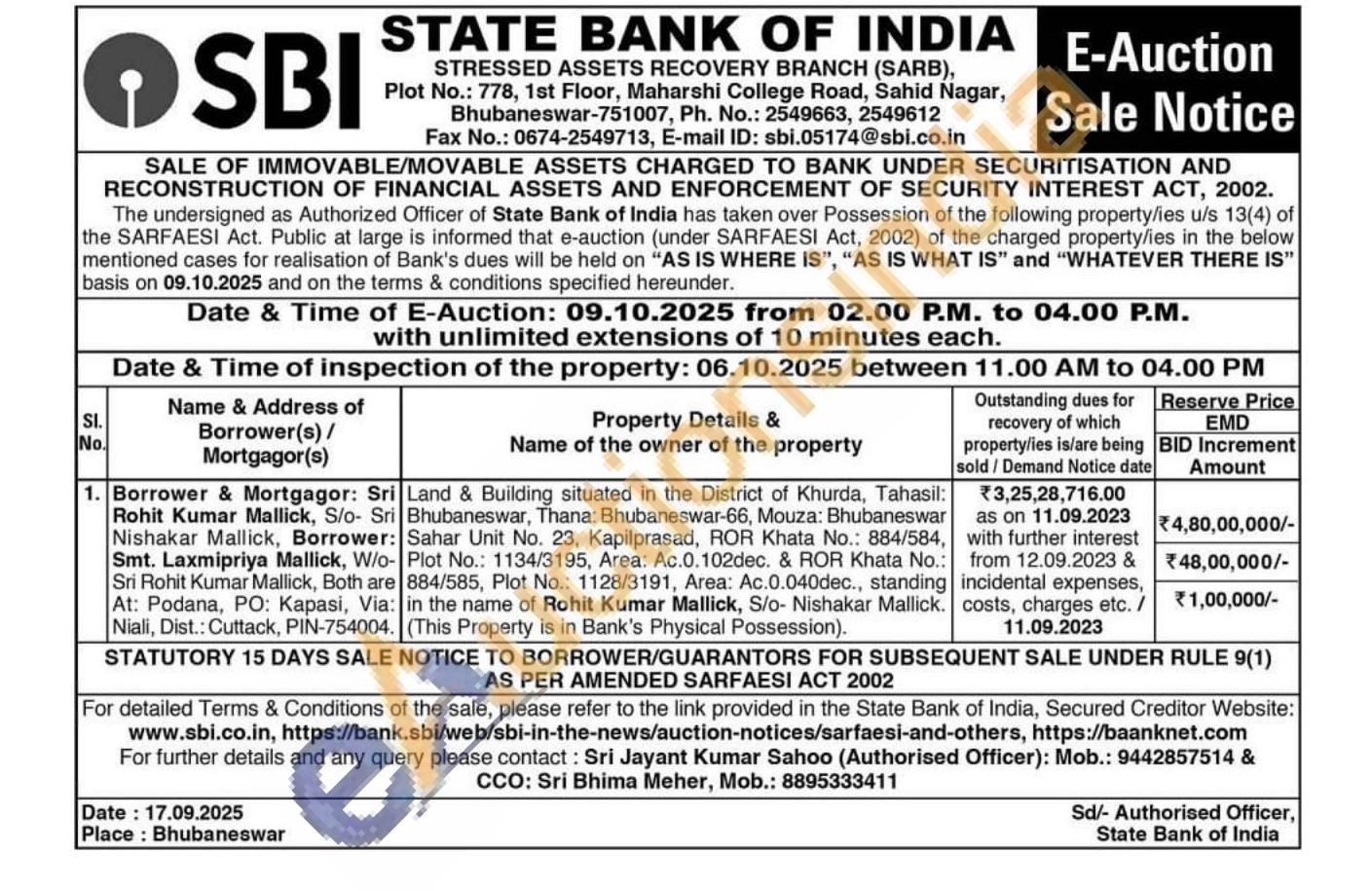 Land & Building situated in the District of Khurda, Tahasil: Bhubaneswar, Thana: Bhubaneswar-66, Mouza: Bhubaneswar Sahar Unit No. 23, Kapilprasad, ROR Khata No.: 884/584, Plot No.: 1134/3195, Area: Ac.0.102dec. & ROR Khata No.: 884/585, Plot No.: 1128/3191, Area: Ac.0.040dec., standing in the name of Rohit Kumar Mallick, S/o- Nishakar Mallick. (This Property is in Bank's Physical Possession).