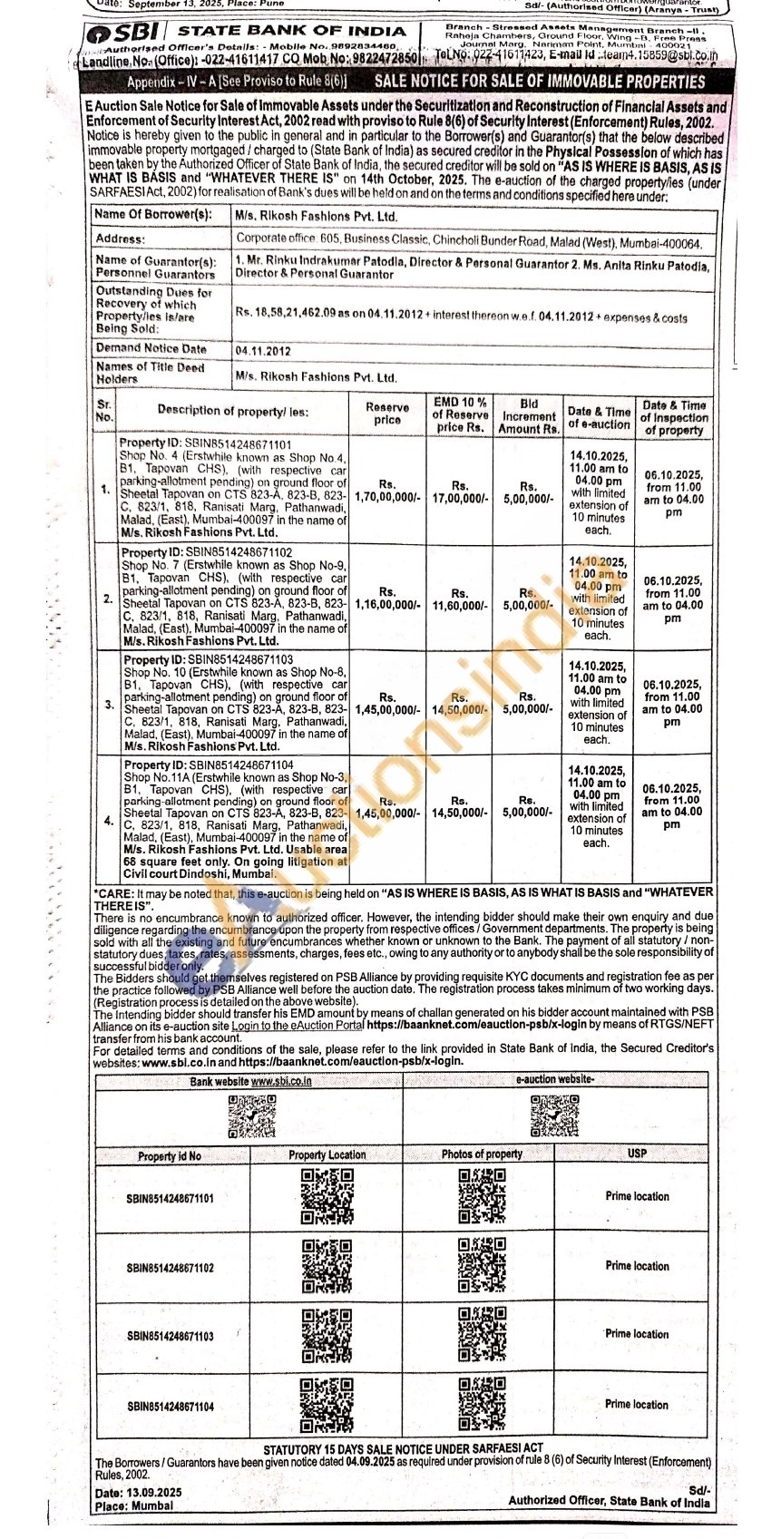 Shop No. 10 (Erstwhile known as Shop No-8, B1. Tapovan CHS), (with respective car parking-allotment pending) on ground floor of Sheetal Tapovan on CTS 823-A, 823-B, 823-C. 823/1, 818, Ranisati Marg, Pathanwadi, Malad, (East), Mumbai-400097 in the name of M/s. Rikosh Fashions Pvt. Ltd.