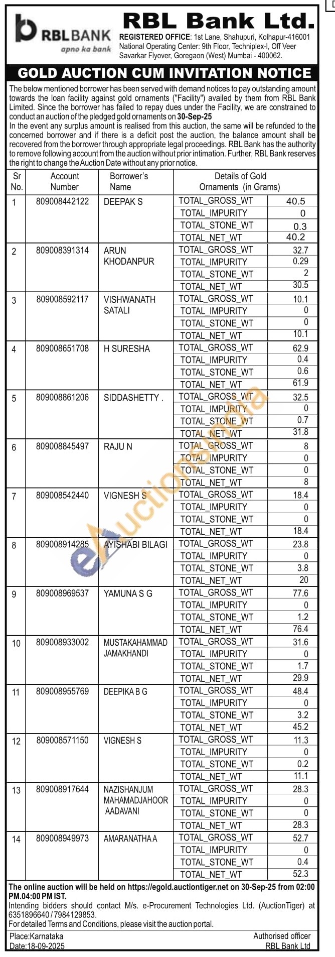 RBL Bank Gold Auctions Auction in Mumbai