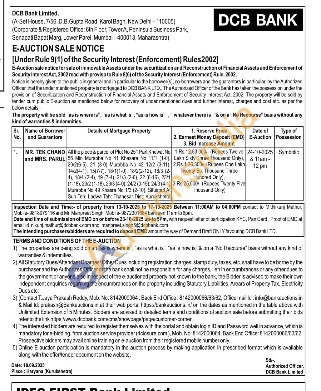 All the piece & parcel of Plot No 251 Part Khewat No 56 Min Murabba No 41 Khasara No 11/1 (1-0), 20/2(6-5), 21 (8-0) Murabba No 42 12/2 (3-11), 14/2(4-1), 15(7-7), 18/1(1-0), 18/2(2-12), 18/3 (2-4), 18/4 (2-4), 19 (7-4), 21/3 (2-0), 22 (6-16), 23/1 (1-18), 23/2 (1-18), 23/3 (4-0), 24/2 (0-15), 24/3 (4-1) Murabba No 49 Khasra No 1/3 (2-10), Situated At Sub Teh: Ladwa Teh: Thanesar Dist: Kurukshetra