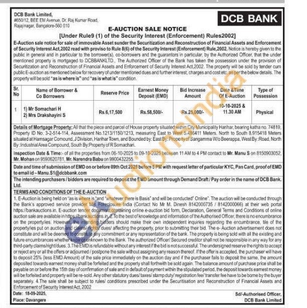 Details of Mortgage Property: All that the piece and parcel of House property situated within City Municipality Harihar, bearing katha no. 74819, Property ID No. 3-2-514-114, Assessment No. 1213/1150/1213, measuring East to West 5.486411 Meters. North to South 8.915418 Meters situated at Hamsagar Comound, J Division, Harihar Town, and Bounded by: East By: Property of Sangamma Wio Beerappa, West By Road, North By:Industrial Area Compound, South By: Property of R Somachan