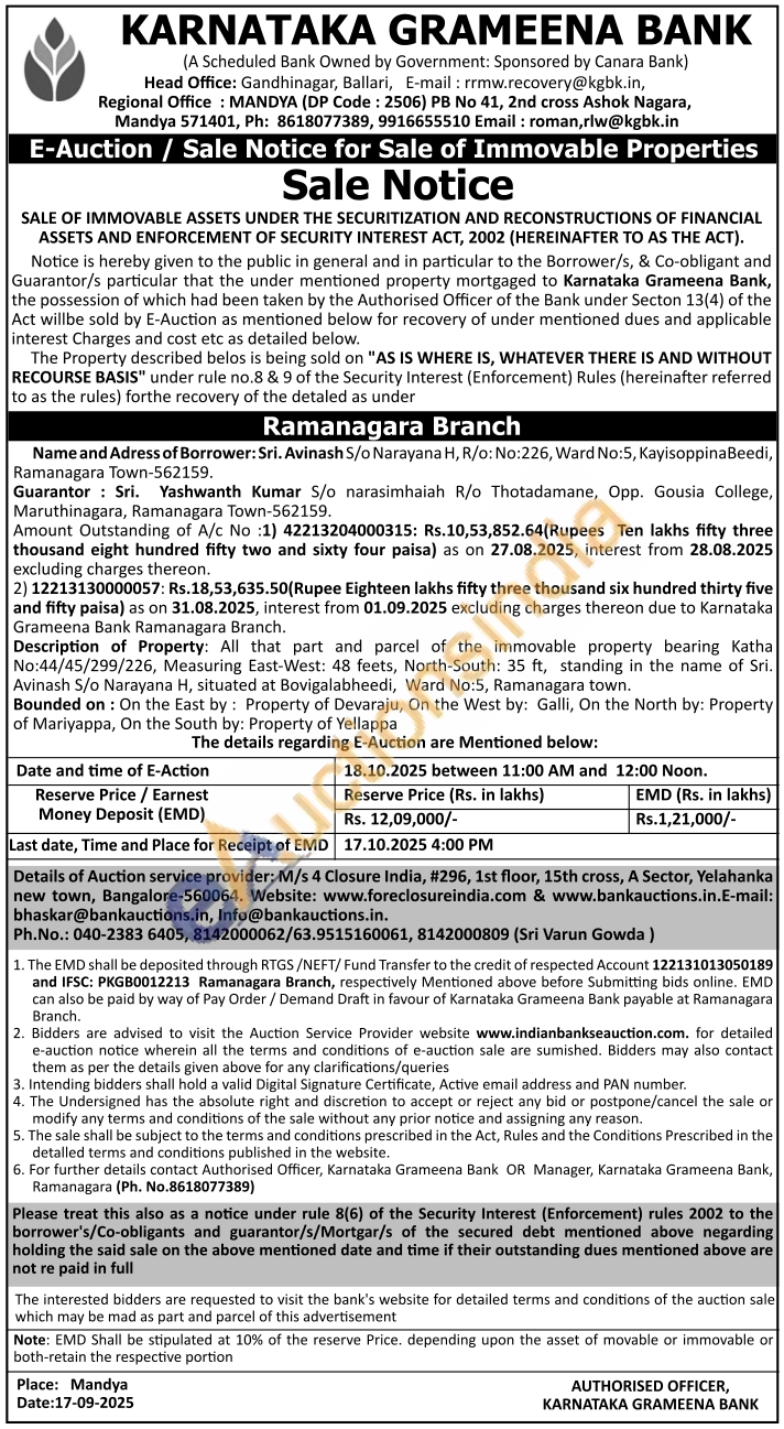 All that part and parcel of the immovable property bearing Katha No:44/45/299/226, Measuring East-West: 48 feets, North-South: 35 ft, standing in the name of Sri. Avinash S/o Narayana H, situated at Bovigalabheedi, Ward No:5, Ramanagara town. Bounded on: On the East by: Property of Devaraju, On the West by: Galli, On the North by: Property of Mariyappa, On the South by: Property of Yellappa
