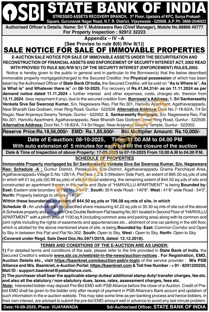 Schedule-A Guntur District, Pedakakani Sub-District, Agathavarappadu Grama Panchayat Area, Agathavarappadu Village D.No. 128/1A, Plot Nos. 1,2 & 3 (Western Side Part), an extent of 895.50 sq.yds of site in which left 51 sq.yds (50.99 sq.yds) of site for Road widening, the remaining extent of 844.50 sq.yds of site and constructed an apartment therein in the name and Style of "HARIVILLU APARTMENT" is being Bounded by: East: Eastern side boundary of Plot No.3-54'0", South: 30 ft wide Road-140'9", West: 41'6" wide Road - 54'0", North: Property belongs to others - 140'9".