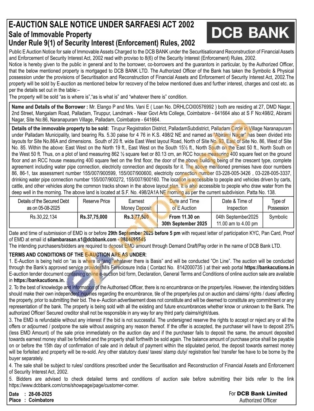 Details of the immovable property to be sold: Tirupur Registration District, PalladamSubdistrict, Palladam Circle in Village Naranapuram under Palladam Municipality, land bearing Rs. 5.30 paise for 4 76 in K.S. 498/2 NE and named as "Abirami Nagar" has been divided into layouts for Site No.86A and dimensions. South of 20 ft. wide East West layout Road, North of Site No. 93, East of Site No. 86, West of Site No. 85. Within the above: East West on the North 19 ft., East West on the South 15% ft., North South on the East 50 ft., North South on the West 50 ft. Thus, on a plot of land measuring 862½ square feet or 80.13 cm, an RCC house measuring 400 square feet on the ground floor and an RCC house measuring 400 square feet on the first floor, the door of the above building being of the crescent type, complete agreement including water pipe connection, electricity connection and deposits for it. The above mentioned premises have door numbers 86, 86-1, tax assessment number 155/007/900599, 155/007/900600, electricity connection number 03-228-005-3426, 03-228-005-3337, drinking water pipe connection number 155/007/900272, 155/007/900160. The location is accessible to people and vehicles driven by carts, cattle, and other vehicles along the common tracks shown in the above layout plan. It is also accessible to people who draw water from the deep well in the morning. The above land is located at S.F. No. 498/2A1A NE morning as per the current subdivision. Patta No. 138.